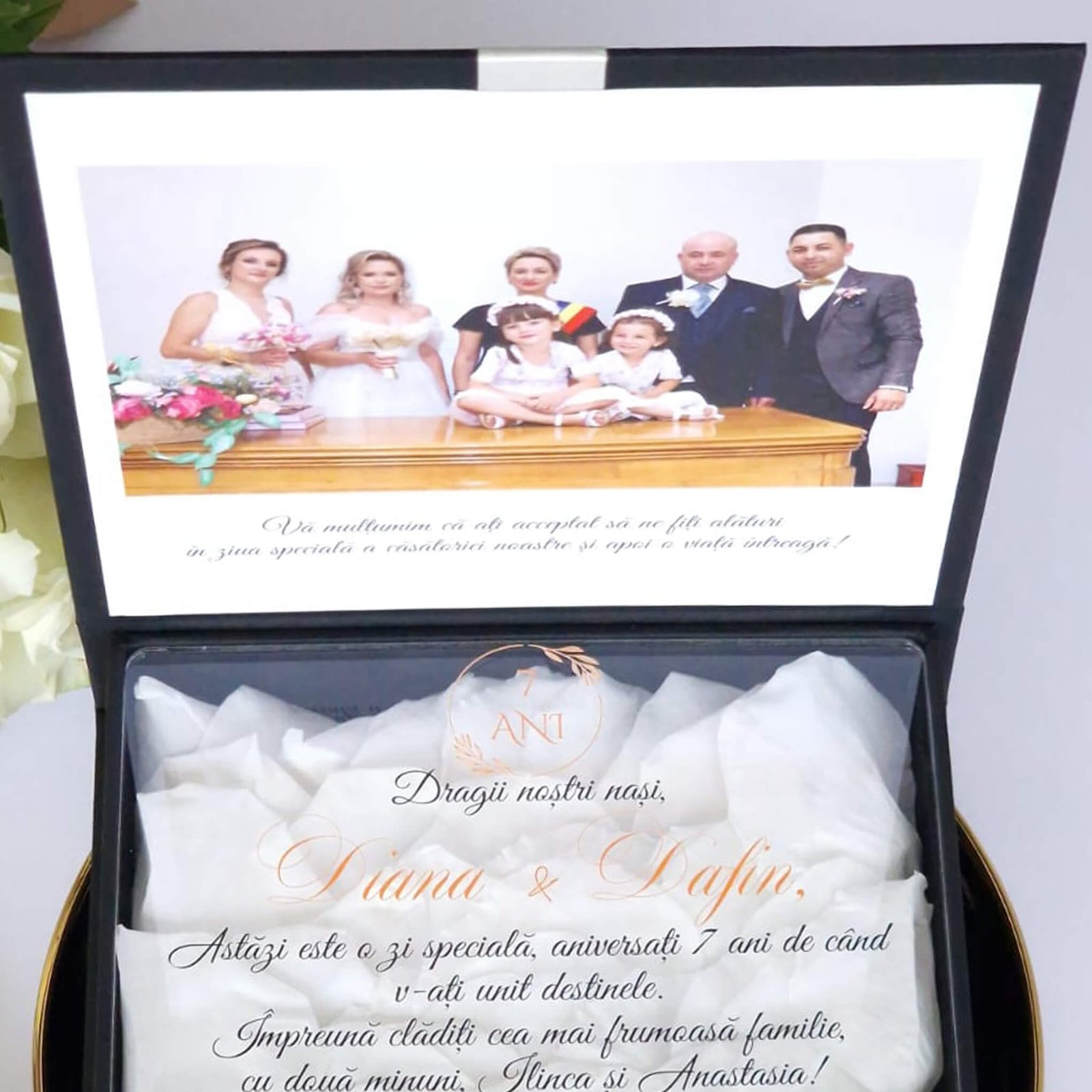 Aceasta cutie cadou pentru nași este alegerea perfectă pentru a exprima aprecierea și recunoștința. Designul său sofisticat și detaliile elegante fac din acest cadou unul memorabil și de neuitat pentru orice ocazie specială.
