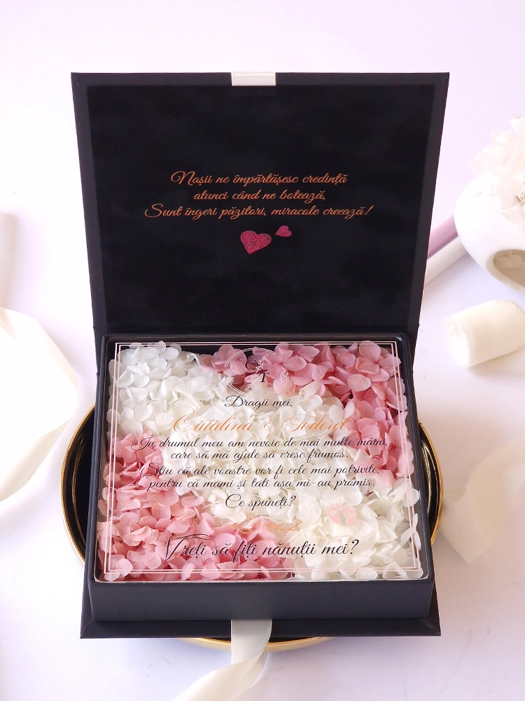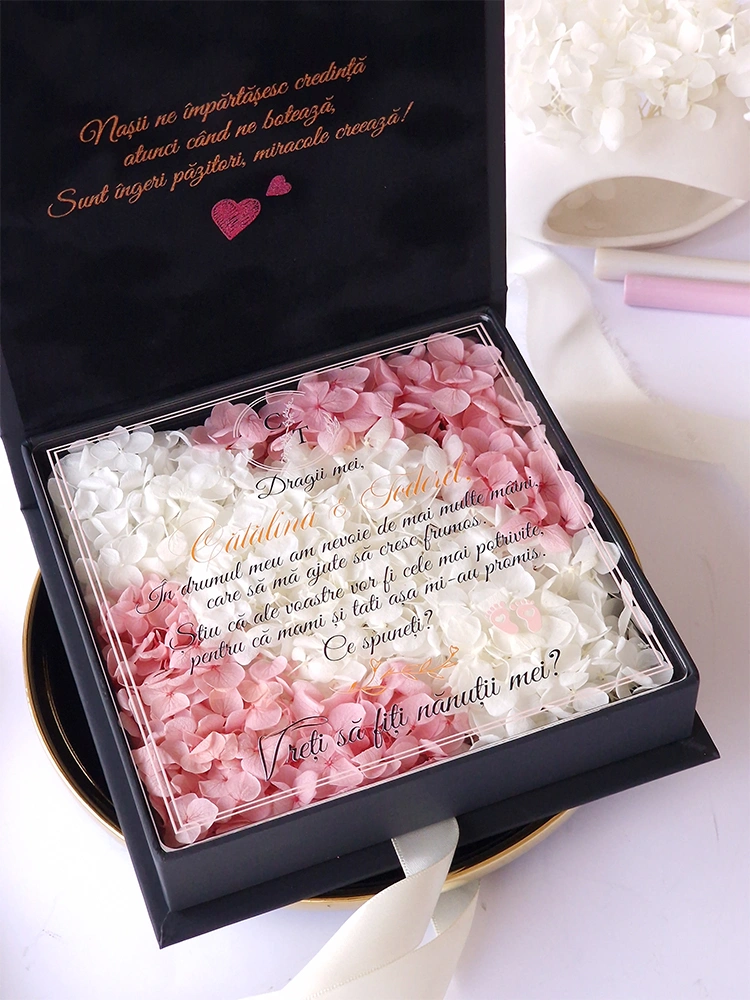 Oferirea unei cutii cadou pentru cererea nasilor de botez este un moment special care merită o prezentare deosebită. Această cutie cadou decorată cu petale de hortensie criogenată doua culori este alegerea perfectă pentru a impresiona și a arăta recunoștința.