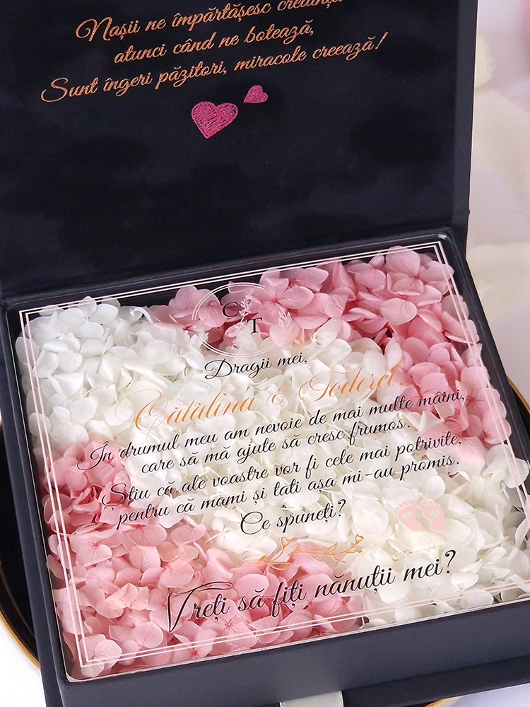 Cutia este decorată cu petale de hortensie criogenată de la prestigiosul brand Verdissimo, fiecare floare fiind atent selecționată și aranjată manual pentru a păstra prospețimea, delicatețea și frumusețea naturală pe termen îndelungat, fără a necesita întreținere.