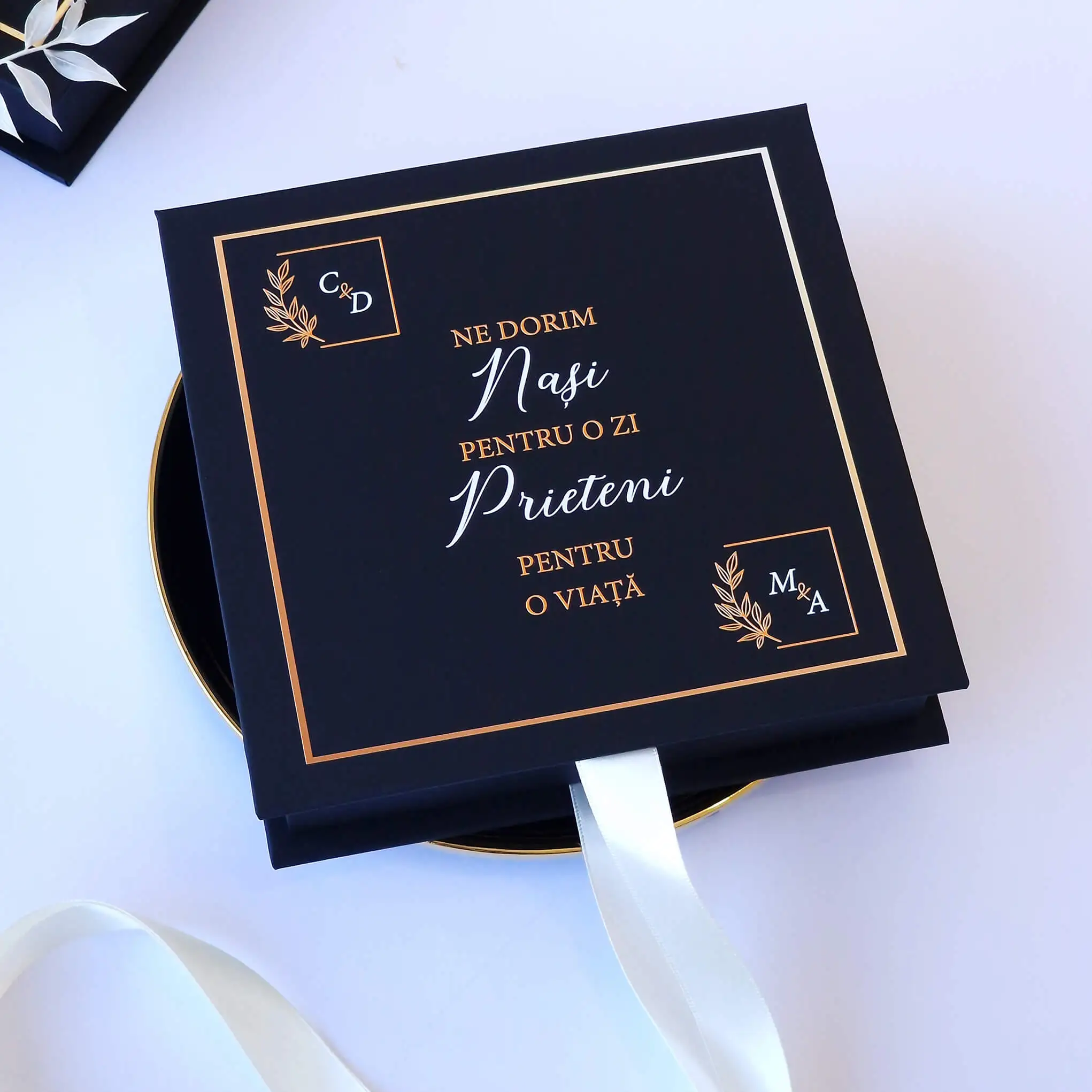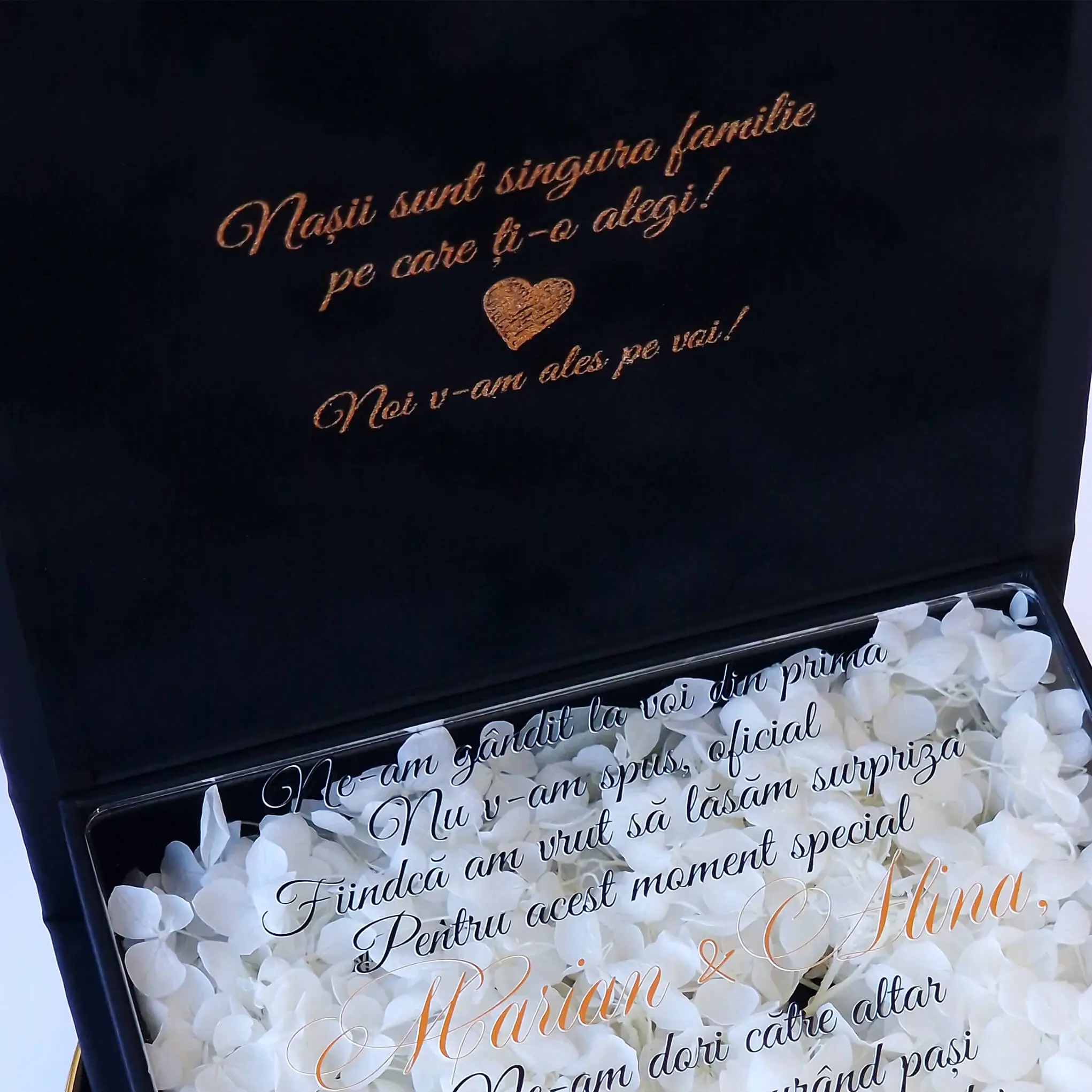 Oferirea unei cutii cadou pentru cererea nasilor de cununie este un moment special care merită o prezentare deosebită. Această cutie cadou decorată cu petale de hortensie criogenată și catifea este alegerea perfectă pentru a impresiona și a arăta recunoștința.