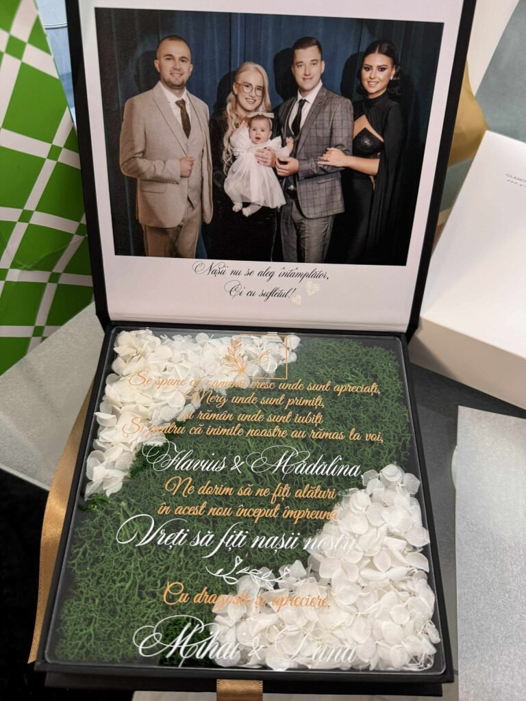 O cutie pentru nasi decorată cu licheni stabilizați si hortensie este o alegere deosebită pentru a marca un eveniment special. Această cutie nu doar că atrage privirile, dar și adaugă un element natural și elegant în decorul oricărei ceremonii.