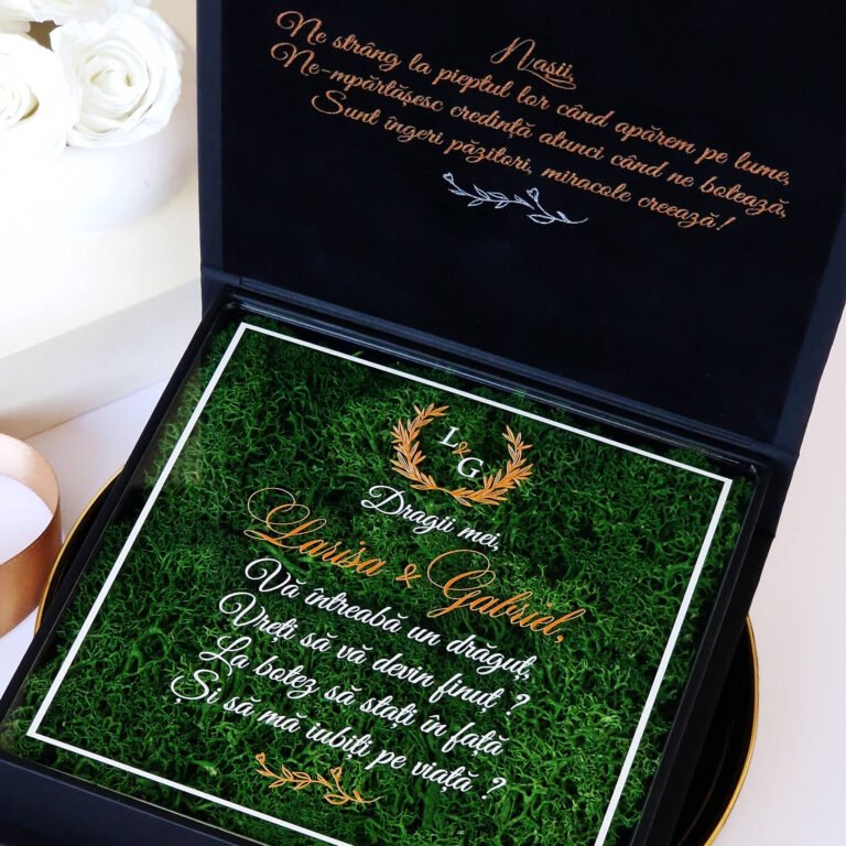 O cutie pentru nasi decorată cu licheni stabilizați este o alegere deosebită pentru a marca un eveniment special. Această cutie nu doar că atrage privirile, dar și adaugă un element natural și elegant în decorul oricărei ceremonii.