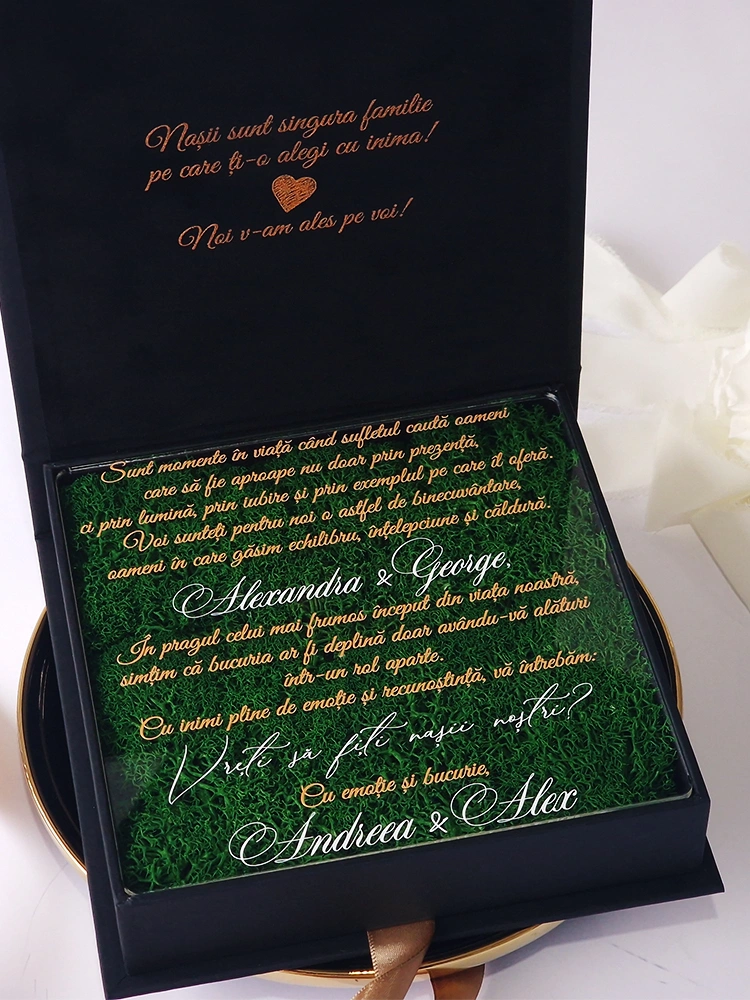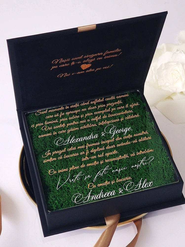 O cutie pentru nasi decorată cu licheni stabilizați este o alegere deosebită pentru a marca un eveniment special. Această cutie nu doar că atrage privirile, dar și adaugă un element natural și elegant în decorul oricărei ceremonii.