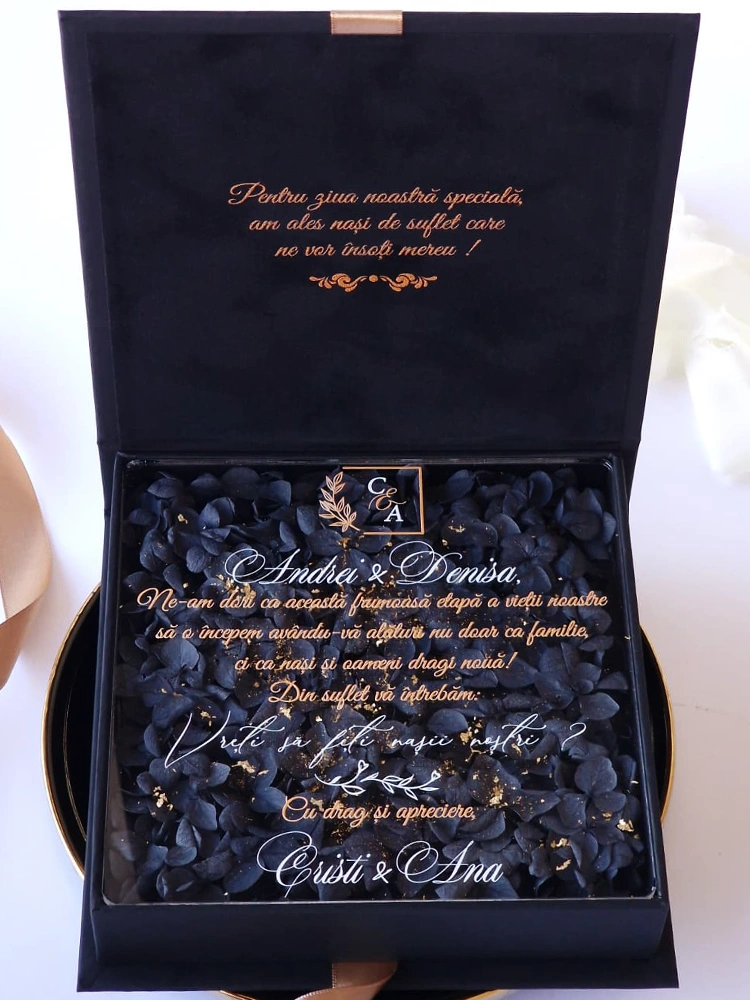Cutia pentru cererea nașilor de cununie „Gold & Black Hortensia” a fost creată pentru a transforma un moment special într-o amintire de neuitat, plină de rafinament și emoție autentică.