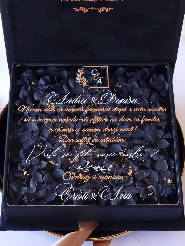 Un dar rar, creat pentru a transforma o întrebare importantă într-un moment care lasă urme în suflet. Cutia „Gold&Black Hortensia” este mai mult decât un cadou – este un simbol al alegerii cu inima.