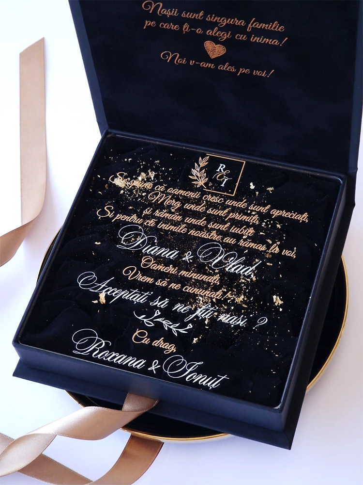 Un dar rar, creat pentru a transforma o întrebare importantă într-un moment care lasă urme în suflet. Cutia „Gold&Black Roses” este mai mult decât un cadou – este un simbol al alegerii cu inima.