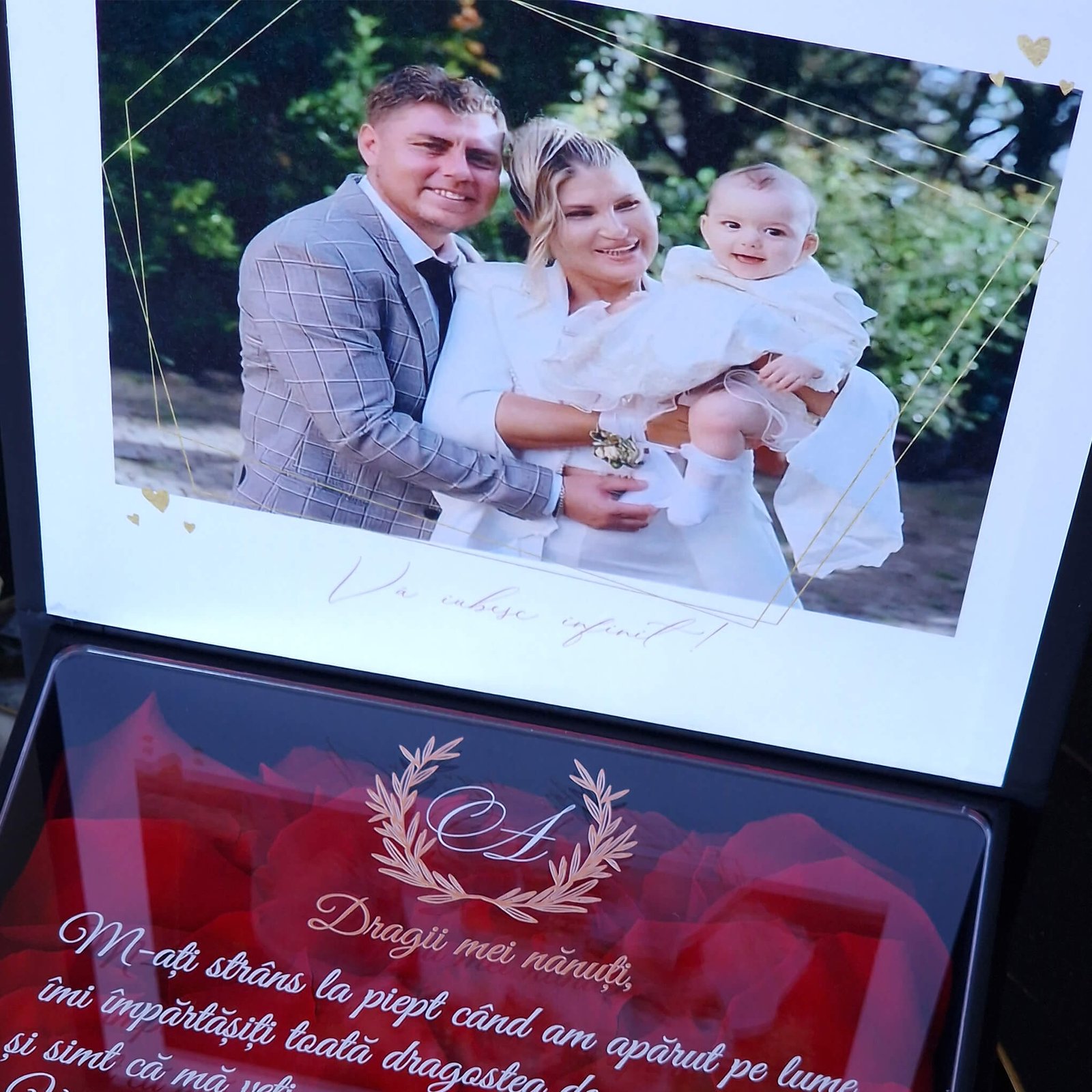 Descoperiți eleganța unei cutii cadou pentru nași, decorată cu petale de trandafir criogenate. Aceasta nu doar că adaugă o notă de rafinament, dar și păstrează frumusețea naturală a trandafirilor pentru o perioadă îndelungată.