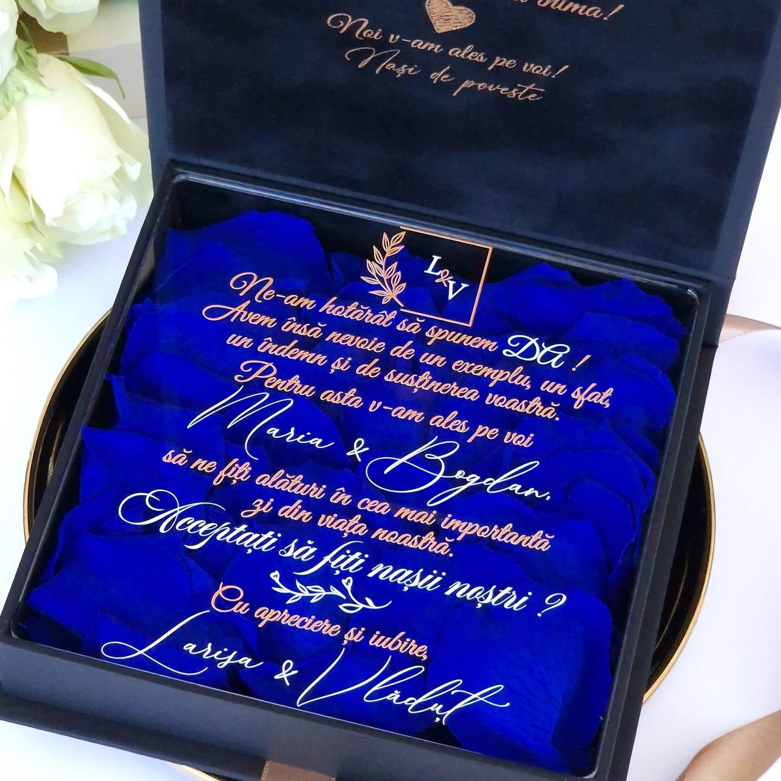 Cutia cadou este fabricată din materiale de înaltă calitate, asigurându-se durabilitate și rezistență. Petalele de trandafir criogenate sunt atent selectate și tratate pentru a-și păstra culorile vibrante și textura delicată.