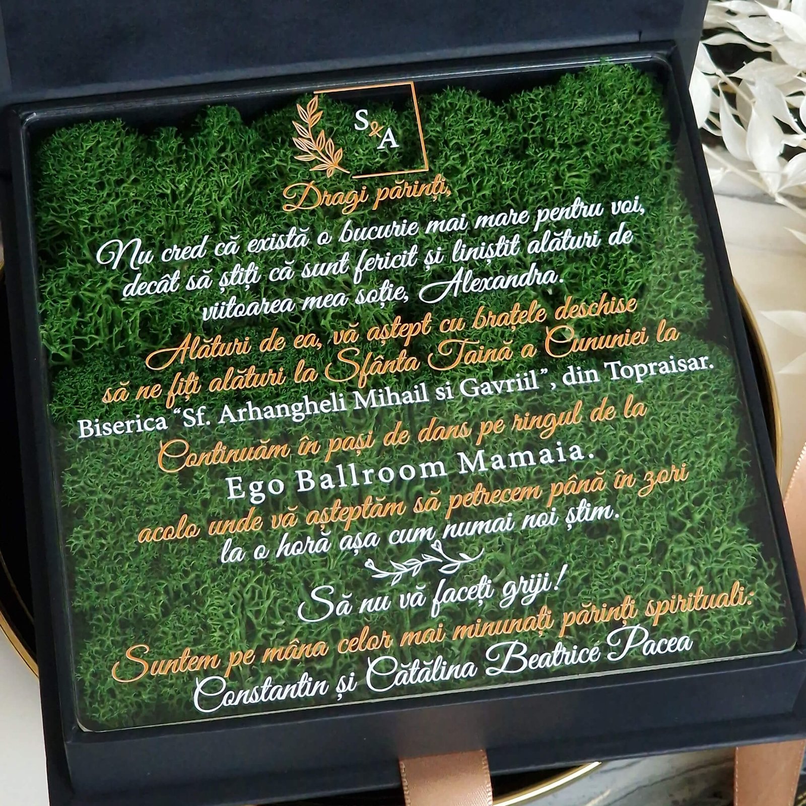O cutie pentru nasi decorată cu licheni stabilizați este o alegere deosebită pentru a marca un eveniment special. Această cutie nu doar că atrage privirile, dar și adaugă un element natural și elegant în decorul oricărei ceremonii.