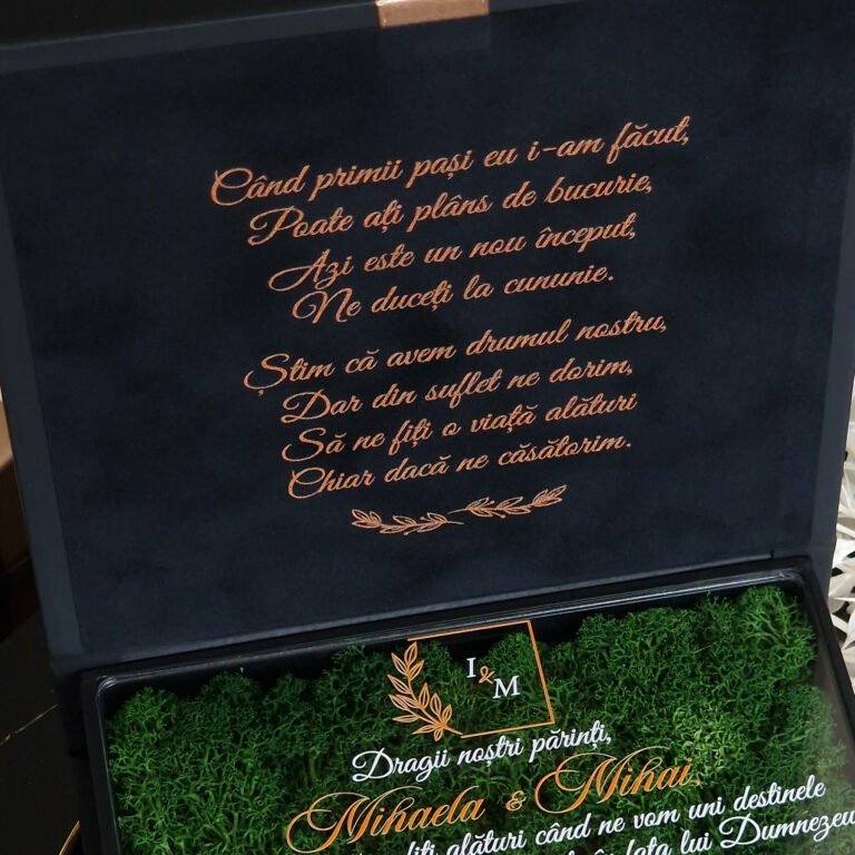 O cutie pentru nasi decorată cu licheni stabilizați este o alegere deosebită pentru a marca un eveniment special. Această cutie nu doar că atrage privirile, dar și adaugă un element natural și elegant în decorul oricărei ceremonii.