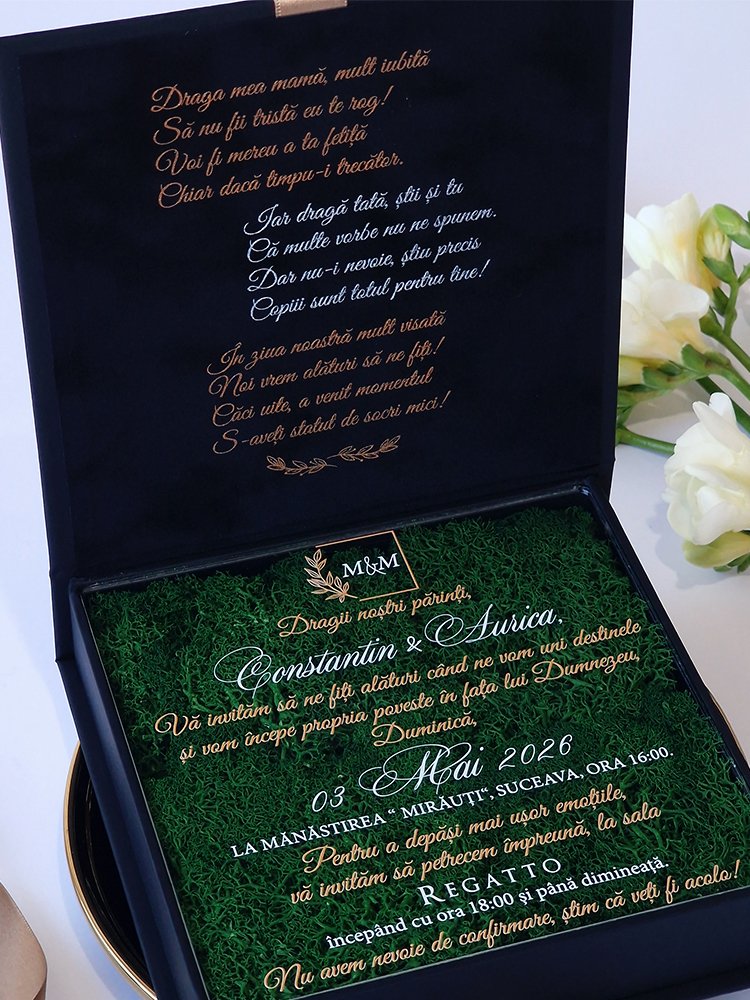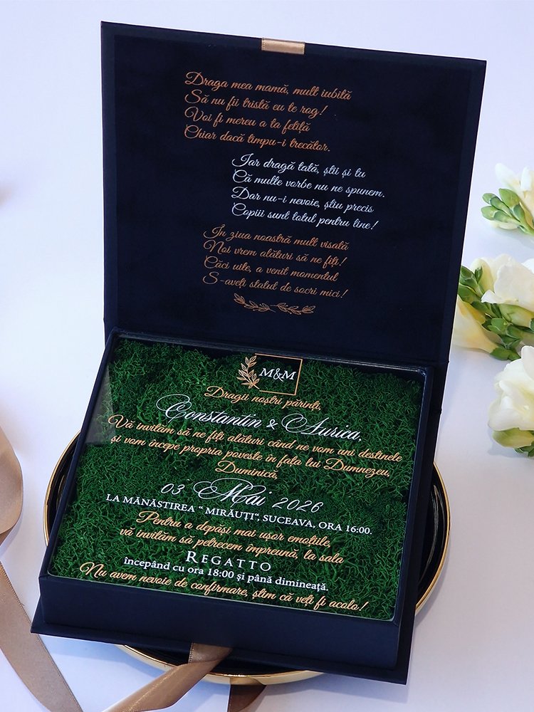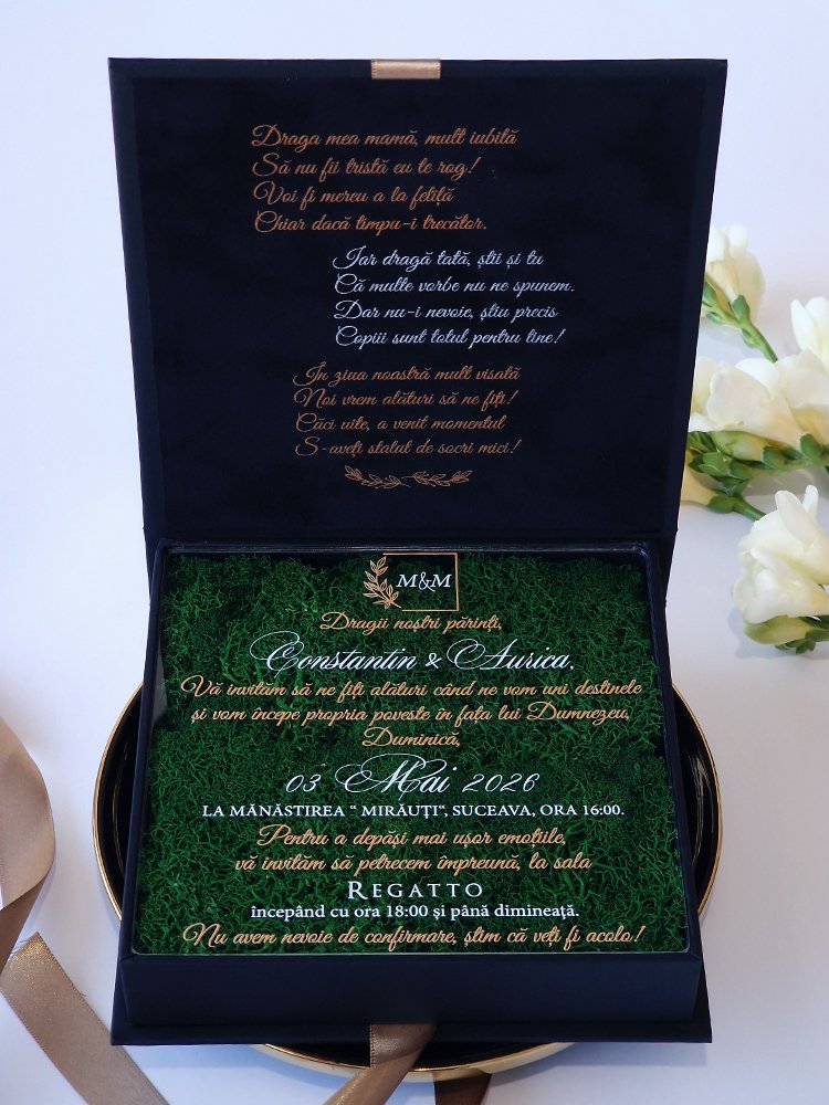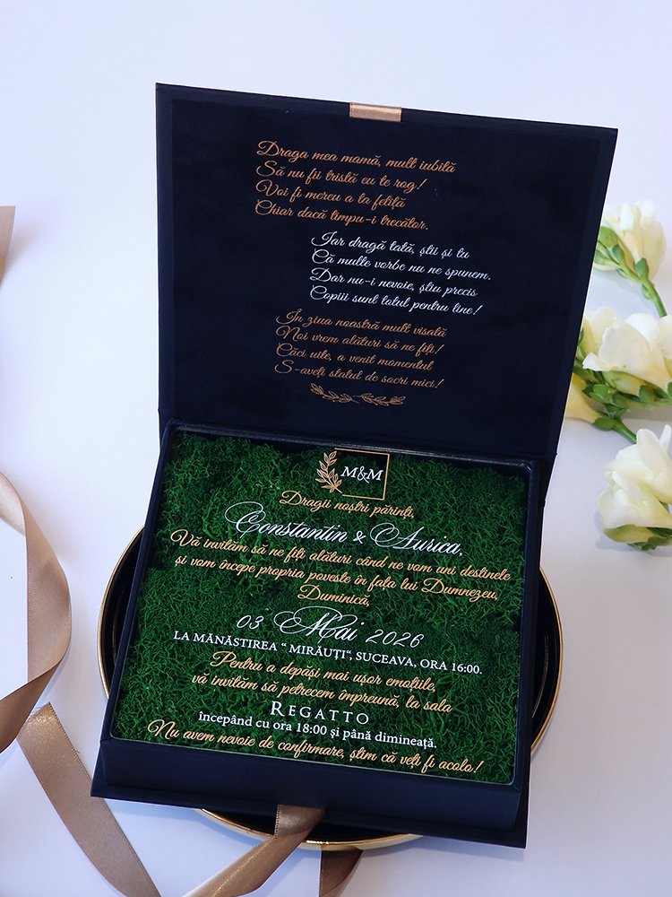 O cutie pentru nasi decorată cu licheni stabilizați este o alegere deosebită pentru a marca un eveniment special. Această cutie nu doar că atrage privirile, dar și adaugă un element natural și elegant în decorul oricărei ceremonii.